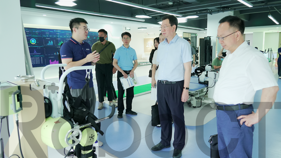 程天科技向院方一行人展示了其自研自產的底層核心元器件,并介紹了其康復養老產品應用的出發設想。程天科技的智能康復中心內,全系列的康復外骨骼、康養輔助機器人、居家康復游戲以及智能康復云平臺悉數出鏡。